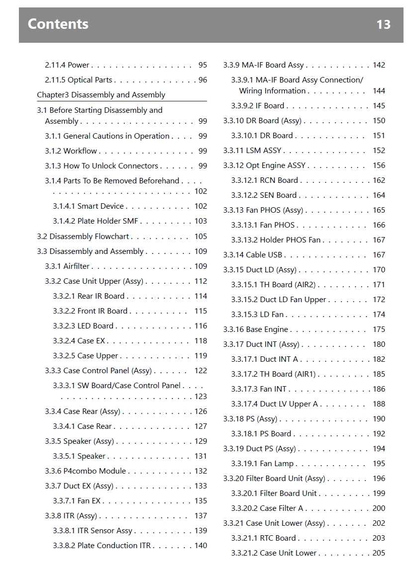 - product maintenance, operating principles, troubleshooting, disassembly and assembly, error codes, connector summary.